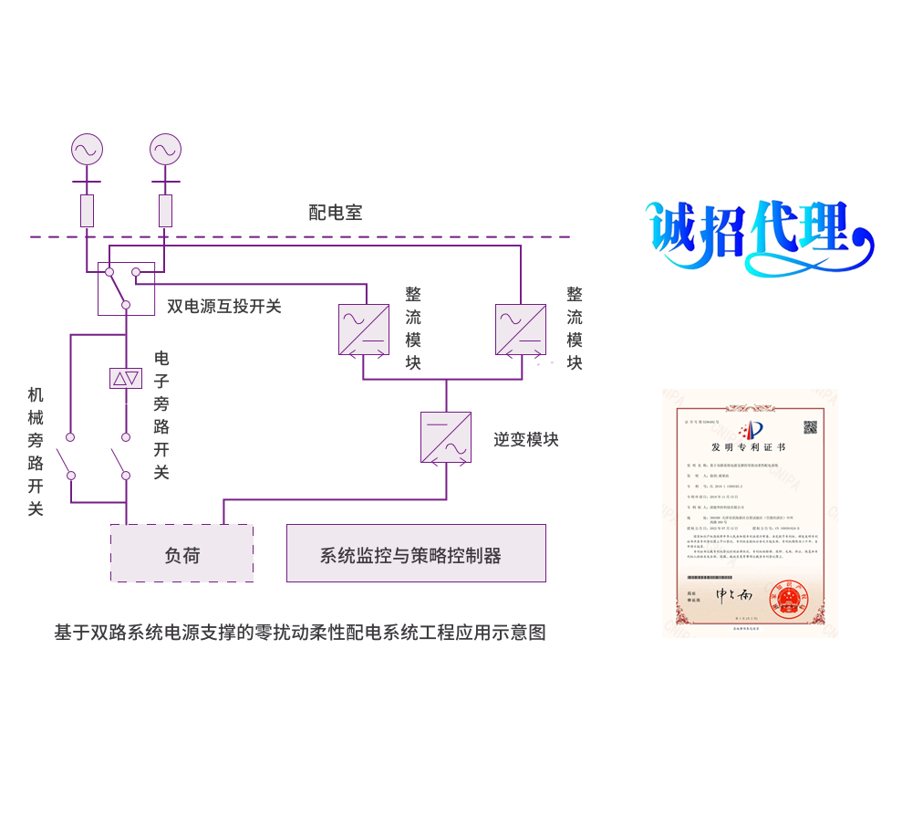 基于雙路系統電源支撐的零擾動柔性配電解決方案采用雙路獨立交流電源經整流變換成直流實現并列運行,再經逆變器變換成交流給終端用電設備供電,實現在任何一路供電電源發(fā)生瞬時(毫秒級)、短時(秒級)或長時擾動時,保證對配電終端設備供電“零擾動”,能夠完全避免電力系統故障和倒閘操作對終端用電設備產生擾動。
